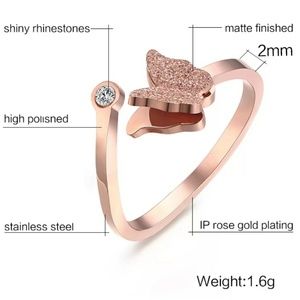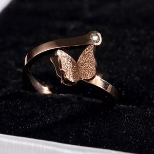 Rose gold butterfly ring. Adjustable ring. Can be worn by any size finger. New without tags. Made of stainless steel. Please contact me if you have any questions. Thank you for looking.