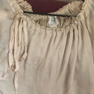Cream almost light tan, color sheer top with puffy sleeves, draw string adjustable neck with a bow that ties..fitted waist line and ends of sleeves..gently worn but, great condition, looks new! Fun, flirty top!