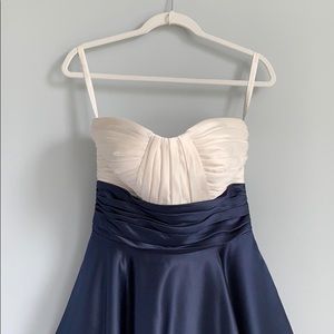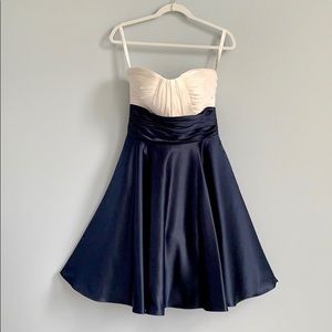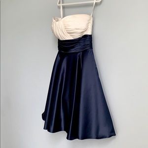 Strapless sweetheart neckline dress made from European Satin. Ivory bodice, Navy skirt w/ zippered back and POCKETS!! Beautiful pleating detail. Worn once. Excellent condition- no stains, snags, or rips
