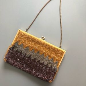 Vintage purple, silver and gold beaded handbag/clutch. Imperfections photographed with beading and some discoloration in the interior. 8” by 5”