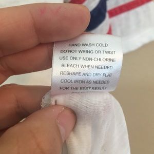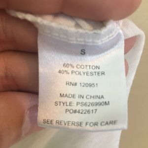Super soft patriotic tee cool striped detail on the arms so comfortable sized small pink rose brand 60 % cotton 40% polyester 22 inches long in front 24 inches long in the back 20 inches at bust