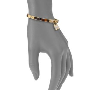 From the Brilliance Padlock collection. A radiant pavé-enhanced plaque and padlock punctuate this slender bangle in a chic tortoise print. Acetate and glass. Goldtone. Signature cubic zirconia detail at interior. Circumference: 6.75 inches. Diameter, about 2. 5" width, about 0. 25" hinged closure. Color: metallic