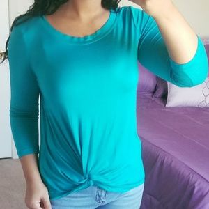 Soft and stretchy, this beautiful basic top features 3/4 sleeves, a scooped neckline, twisted knot front detailing which is slightly off to the side and a longer hemline for coverage over pants or leggings in the back