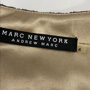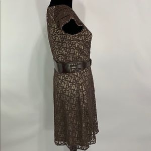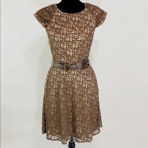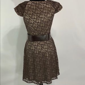 Super cute brown lace overlay with tan satin like lining Mac New York by Andrew Marc. Side zipper. In excellent condition! It does come with the belt and it has a little damage on the end as pictured. It measures approximately, lying flat, 37” long, 18” across chest and 14 3/4” at smallest part of waist. Size 4