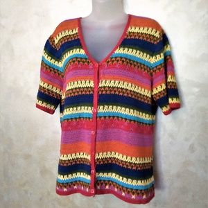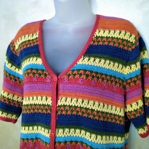 Beautiful vintage crochet cardigan by Casual Corner Annex! Vibrant, bright colors with cute square red buttons. Medium weight ramie/cotton blend. It has the feel of a high quality handmade garment.