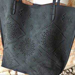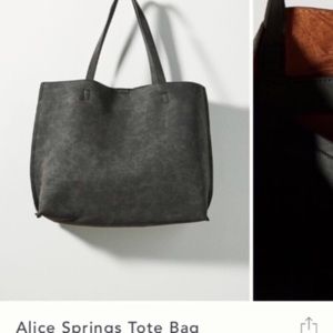 Beautiful Anthropologie Tote. Bag is called black but it’s really more of a dark charcoal. It is faux leather and has one attached inner pouch. It is a great size for a laptop. Bag is 15” wide, 14” tall and has 23” straps. It has brand tags but not store tags.