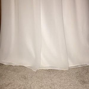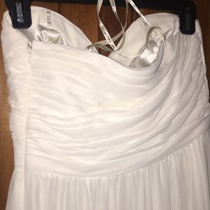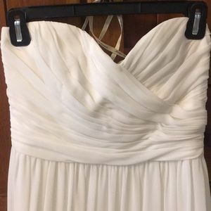 Strapless Ruched Chiffon Sweetheart Gown in Ivory. Style # 450017. Worn once. Professionally hemmed and dry cleaned. Length from bottom of bodice is approx. 43.5”. 100% Poly, lining 90% poly / 10% spandex. Small stain right at hem on the back of the dress - see photo. Not noticeable. Dress may be dyed to match other colors.