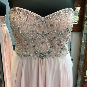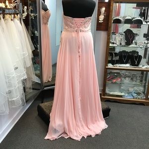 The strapless sweetheart bodice is covered with sparkling silver beading and has a lace up back to ensure a perfect custom fit. The flowing chiffon skirt is gathered at the waist for a full and dramatic silhouette that ends in a puddle train.