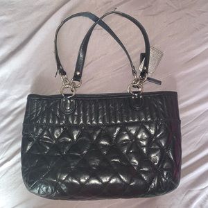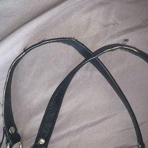 Authentic Coach shoulder bag. Real leather with a quilted look. Used - straps are a bit worn (see pictures) but otherwise in good condition! Just needs a little TLC. Zipper closure - cute outside pocket that closes with a buckle. Light blue silky fabric on the inside with a zipper pocket. Ask any questions! 🤗