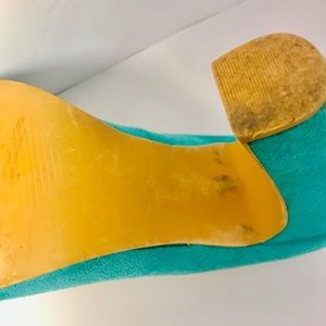 Beautiful teal blue pumps, gently used. Small black scuff on right shoe. Stain on the back of the heels. Bottom of shoes have some wear. Shoe looks like new minus a few scuffs. Size 9