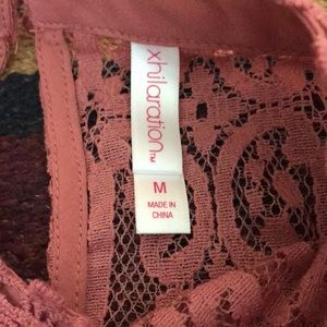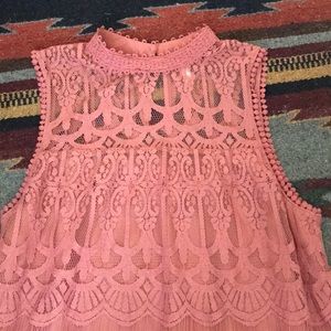 Size M, Mauve mock neck sleeveless top with lace detailing over a nylon inner lining. Long in length, more of a tunic style.