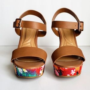 A toe strap and ankle strap with side buckle closure. A bold, floral printed platform wedge sole.