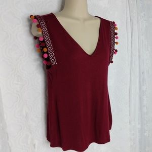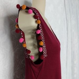 Features: Soft and stretchy burgundy relaxed fit tank with fun pink/yellow/orange pom pom trim. So adorable! Please see photos for more details. Available in various sizes.