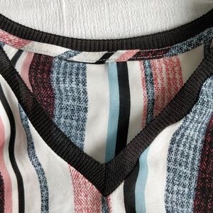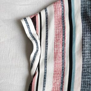 A cute, striped shirt. Made of polyester. Doesn't have a brand tag on it. There's no printed size on the top, but it fits me well and I'm almost always a medium. No rips, stains, or other damages. Shorts are also for sale in my closet. Open to offers!