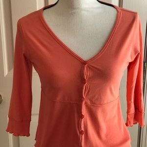 Great little summer top from Bay Studio. It is size PS. Has 6 button front which you can unbutton and wear as a lightweight cover over your favorite cami or tee. Top is coral in color. Maybe a little more to the orange side than peach side But not a true orange