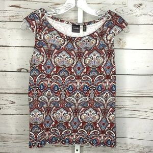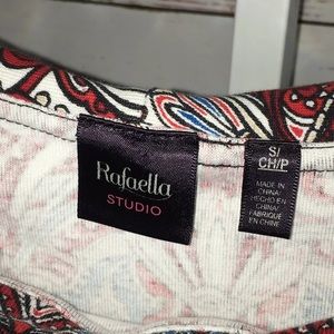 Rafaella Studio sleeveless blouse size small. Blouse is sleeveless and is red, black, white, tan orange and blue. Blouse is in great overall condition. Fabric content as follows: Cotton. Measurements as follows: Length 23 inches, bust 18.5 inches.