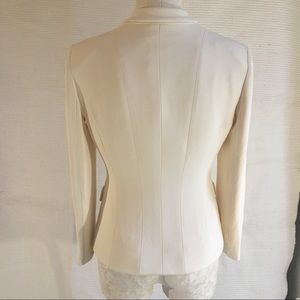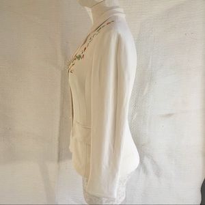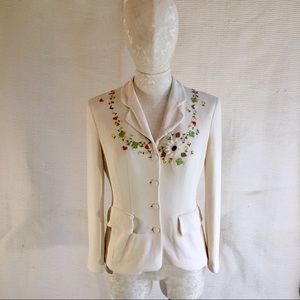 Moschino Cheap & Chic Ivory suit jacket with embroidered flowers and clovers that frame the face. 100% rayon, lined. Flattering seams & so charming. 1 corner of frayed lining under pocket flaps p7, but unseen & secure. EUC.