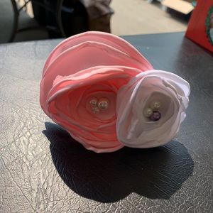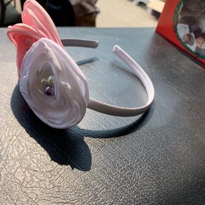 Pink and white satin rosettes on bodice on matching headband. Bodice is elastic