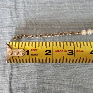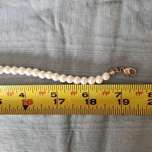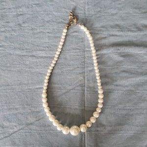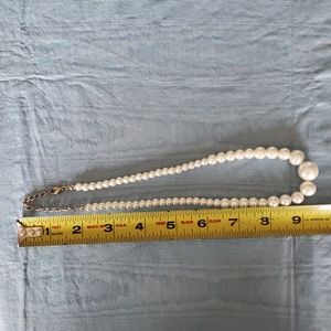 Barely worn faux pearl necklace with lobster clasp closure. Approximately 19" in length when open; approximately 9.5" when closed.
