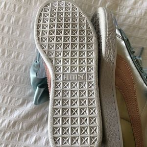 Prettiest Puma Sneakers in pastel patent with satin bow. Worn a few times but was a size big on me.