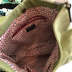 Great shoulder bag with lots of room. Lined. 1 zipper compartment inside and 2 extra storage compartments inside for sunglasses and cell phone. Olive green Bottom measures 14 x 4”.