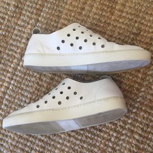 Made in Portugal, these leather trainers can be worn with laces or without. I cut a slit in the neoprene lining to make it easier to put on & the is some slight wrinkling in the leather (discounted price reflects these imperfections). Super comfortable, just a bit too big for me! Sz 39
