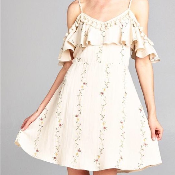 Feel pretty in the Sienna Dress featuring spaghetti strap cold shoulder ruffled top dress . Model is wearing a size small.