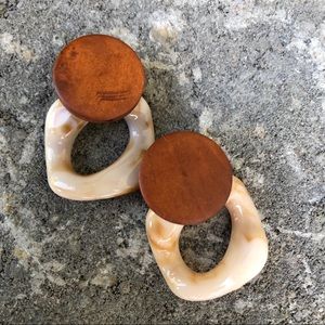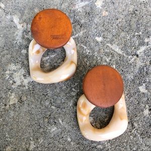 Simple circles accented by creamy caramel swirled acrylic resin dangles are a warm and modern addition to your summer style. 1.75” long by 1.25” wide.