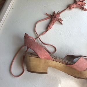 ✨ Sam Edelman peachy pink suede strappy sandals with wooden platforms! The ties have cute tassels and wrap around your ankles / calves.