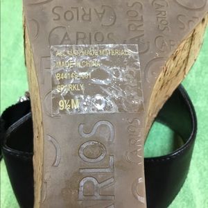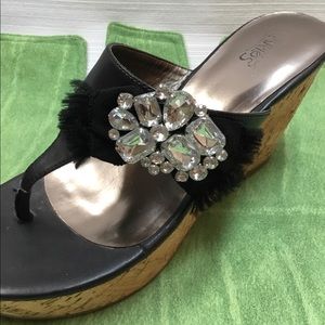 I usually ship in 24 to 48 hours. Exciting Black and Cork Looking Thong Wedges with Rhinestones Accents. Size 9.50 M. All man Made. Heel Height is 3.50 inches. May have been worn 1 time or just tried on. Very Good Condition.