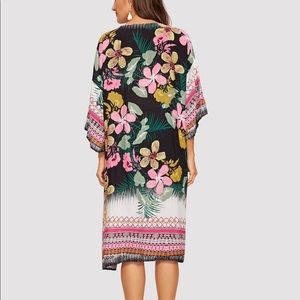 So pretty!! Floral and geo print kimono/ cover-up. Fits true to size. 100% Viscose. 3 quarter length sleeves.