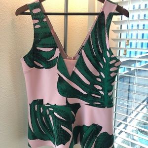 Fun floral pattern for summer! Zippered back and small mesh at bottom of deep V. Soft but sturdy material.