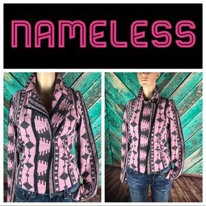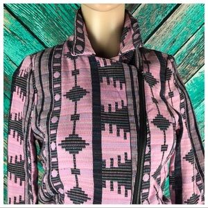 100% cotton moto jacket with black embroidered Aztec pattern. Jacket measures 18 inches from pit to pit and 22 inches from the top of the shoulder to the bottom of the hem. Jacket is fully lined with pink cotton lining. In excellent condition.