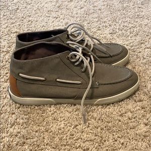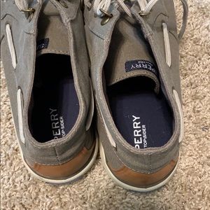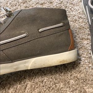 Grey ankle-high women’s sperry shoes. Worn a couple of times. Minor discoloration on bottom white part of shoes, but otherwise in excellent condition