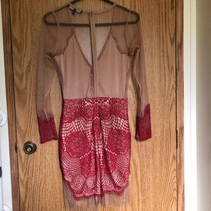 Brand new without tags. Never worn. Gorgeous For Love and Lemons Antigua Mini Dress in red. Nothing screams romance like this lace and mesh dress! This bodycon dress features a crochet lace body and arm cuffs attached to nude mesh. It’s got a zip closure up the back.
