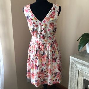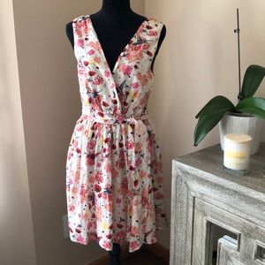 In excellent condition, pretty design and vibrant colors, v-neck, belt included, cotton material, lining under the dress is included, small zipper on the back. Length-34”, bust -17”