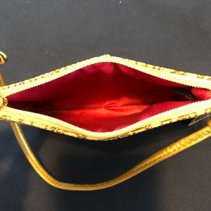 Cream colored wristlet with gold outline.