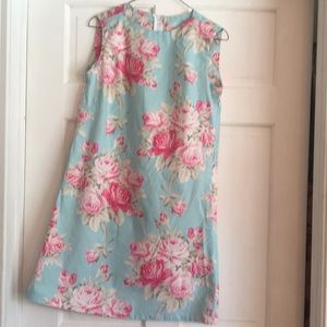 A beautiful floral dress! Pretty blue with pink roses. Zippers in the back. Not lined. Armpit to armpit is 16.5 inches Shoulder to hem is 32 inches. Made by a local designer