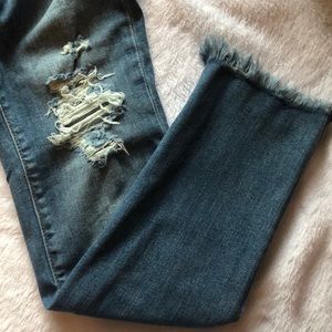 Perfectly stretchy, medium wash denim shapes a high-rise fit with belt loops, five-pocket cut, and zipper and button fly with branded top button. Whiskering and distressing decorate the straight pant legs with slightly cropped, stepped and destroyed ankles.