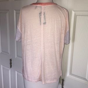 Cute soft color block tee by Rag & Bone! Peachy/pink semi sheer tee with coral around the neckline and light purple sleeves. Small slits at sides