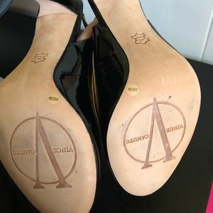 New in original box! Vince Camuto Slingback heels, Size 8.5. Open toe, black patent leather material with gold chain link metal trim around toe. 3 inch heel. Non-smoker home. Offers welcome!