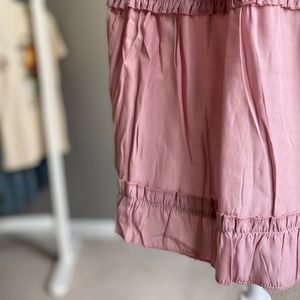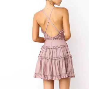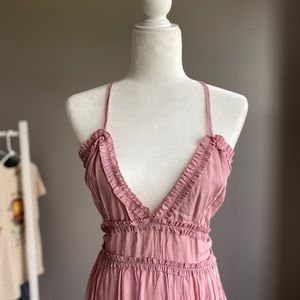 A ruffle detail tunic dress in crinkle material with a v-neck, fitted waist, and adjustable straps. Unlined.Model wearing nude half slip. Slip not included. Brand new with tags!