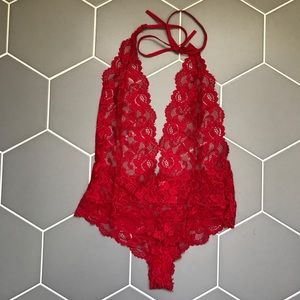 Open Back Halter Plunging Lace Teddy, Sexy One Piece Lingerie Plus Size