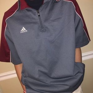 Brand New! Never been worn but does not have tags on it. This is an adidas 1/4 zip polyester pull over short sleeve. The color is a darker red/maroon, grey body, and white trim. My favorite part about this pullover is the 3 white strips on the back representing adidas. It has pockets in the front and an adjustable bottom.