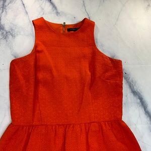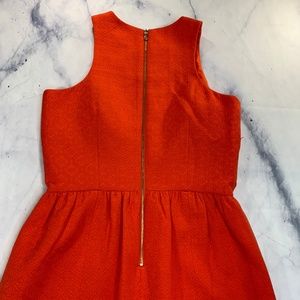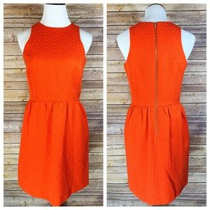 Bright and fun Cynthia Steffe sleeveless dress! Gorgeous bright orange textured brocade fabric with a cinched waist and gold exposed back zipper closure, with full orange lining and high neckline. Slight discoloration on inside collar (pictured). In very good condition!