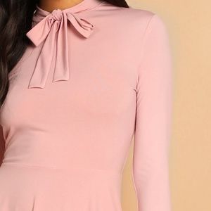 Cute pastel pink midi dress!! Fit & flare, midi, bow tie collar, long sleeve dress for spring! Fabric has some stretch.