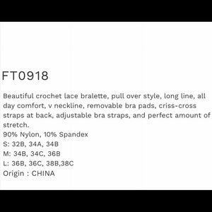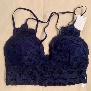 Gorgeous crochet lace bralette in navy with removable pads and adjustable straps.