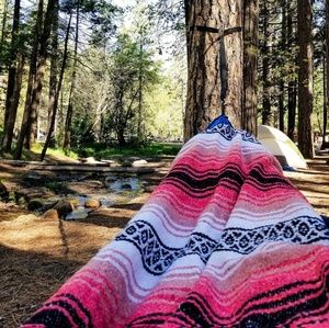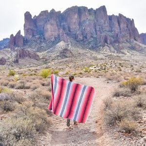 Get cozy with the boho vibes of this stylish Mexican Blanket. The perfect go anywhere blanket that fits right in at the beach, the mountains, in your home & anywhere else adventure takes you. Coral, melon & white stripes bring a modern flair to this southwest blanket style & lets your personality shine.