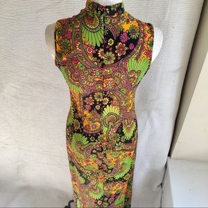 Legit flower power. Authentic 1960s 1970s vintage sleeveless Asian-style long dress. side slits, decorative frog buttons, mandarin collar, back zip. Vibrant electric colors trippy psychedelic floral. Lightweight stretchy - dry clean only tag. Dress up or down! EUC.