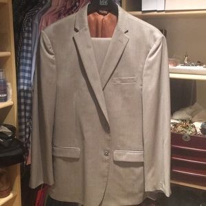 Jos A Bank Joseph Suit. Solid Taupe. Striped in the weave of the fabric. 2 button, side vents.
